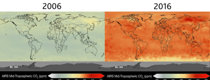 La imagen que vemos es devastadora. Muestra la variación en la concentración de dióxido de carbono que se ha producido en la troposfera de 2006 a 2016, y el paso radical del color ocre al rojo nos indica los altísimos y peligrosos niveles en los que nos movemos.
