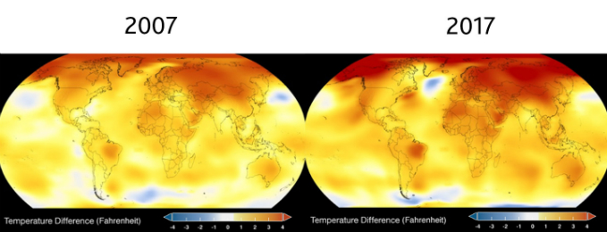 Y es que, si el aumento en la cantidad de dióxido de carbono incrementa a su vez la temperatura del planeta, en esta imagen tenemos el terrible #10yearschallenge del calentamiento global. Precisamente, el último informe IPCC viene a alertarnos del peligro de que la temperatura siga aumentando y de que si no se cumplen los máximos establecidos en el Acuerdo de París, las consecuencias para el planeta serán letales.