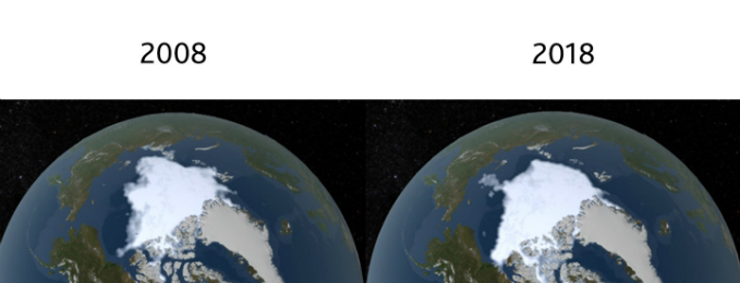 Una de las consecuencias más palmarias del calentamiento del planeta es el deshielo de los polos, ya que también la temperatura del mar asciende y derrite el casquete de hielo en el Ártico y en el Antártico. Si nos fijamos en la foto, vemos cómo se ha reducido el área blanca que representa el Ártico. Según los datos, la pérdida anual de masa de los glaciares de los dos polos equivale a 268 millones de piscinas olímpicas y solo la superficie helada del Polo Norte disminuye a una velocidad de un 12,8 % por década.