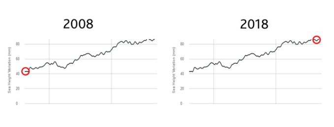 La disminución de los glaciares lleva asociado una catarata de problemas para el planeta, el más evidente es el aumento del nivel del mar. En este gráfico podemos ver cómo no solo no ha parado de subir en la última década, sino que, además, lo hace de manera exponencial. El promedio del nivel del mar en la media global es de 3.1 (± 0.3 mm) por año, con una aceleración de 0.1 mm anual durante el período de 25 años.