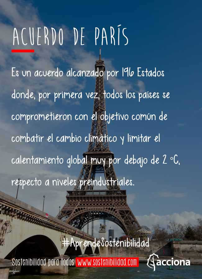 El Acuerdo de París es el pacto global alcanzado por los 196 Estados miembro en la COP21, que tuvo lugar en diciembre de 2015. Por primera vez, todos las Partes de la Conferencia, 195 países más la Unión Europea, estuvieron de acuerdo en poner en marcha las medidas internas oportunas para mantener el calentamiento global muy por debajo de los 2 0C en comparación con los niveles de la era preindustrial.