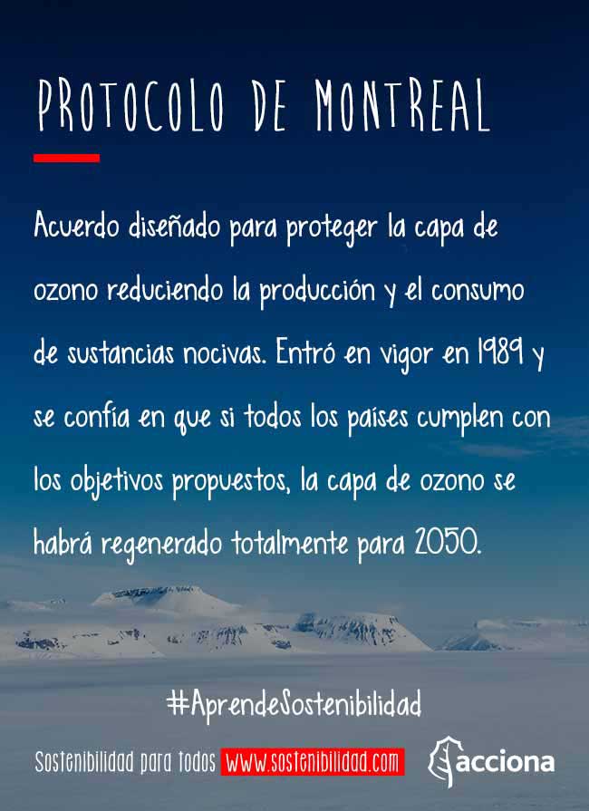 El Protocolo de Montreal, que entró en vigor en 1989, es un pacto internacional medioambiental cuyo objetivo es proteger la capa de ozono, y en los últimos veinte años ha logrado erradicar los clorofluorocarbonos (CFC) para la refrigeración, uno de los principales gases causantes del efecto invernadero.