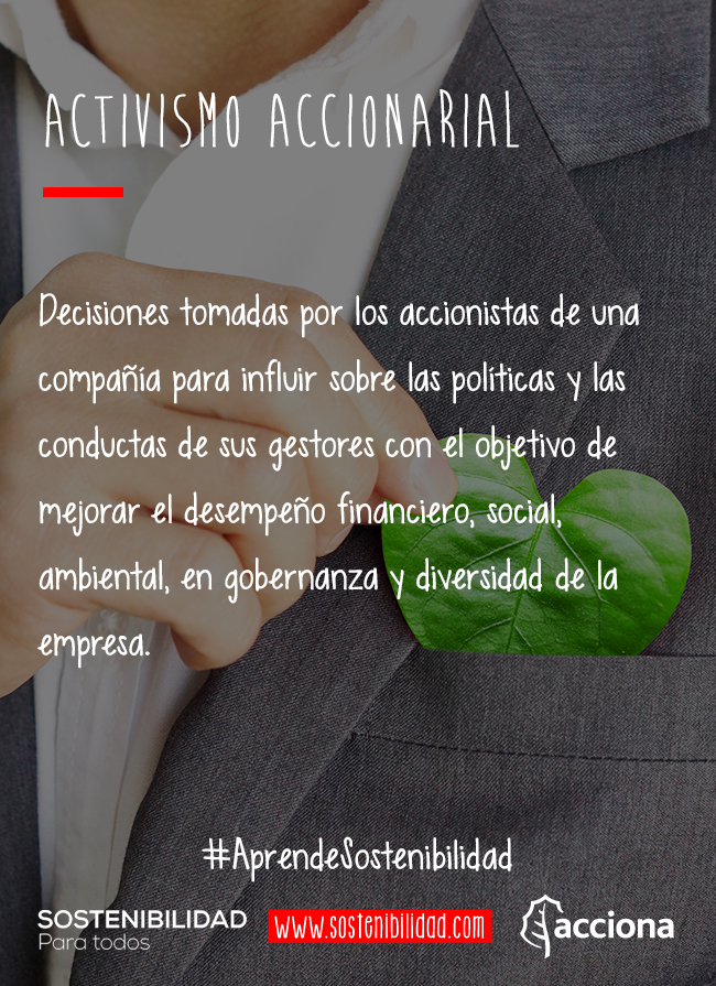El activismo accionarial consiste en las decisiones tomadas por los accionistas de una compañía para influir sobre las políticas y las conductas de sus gestores con el objetivo de mejorar el desempeño financiero, social, ambiental, en gobernanza y diversidad de la empresa.