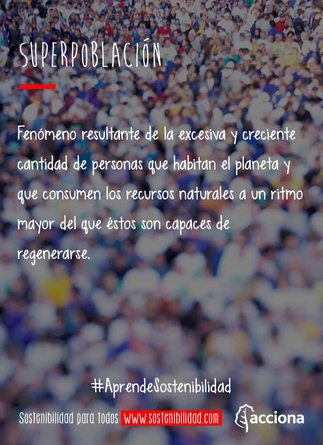 Se trata de la superpoblación: fenómeno resultante de la excesiva y creciente cantidad de personas que habitan el planeta y que consumen los recursos naturales a un ritmo mayor del que éstos son capaces de regenerarse.