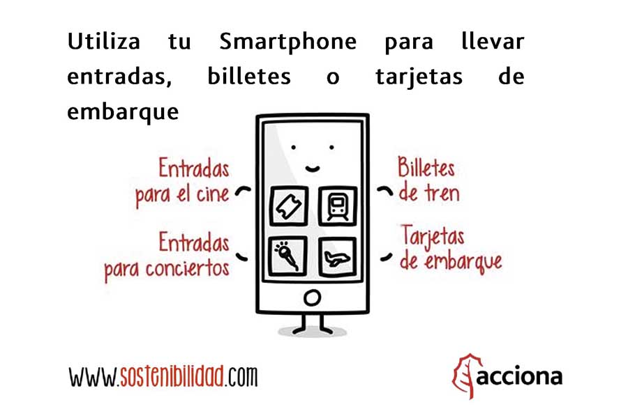 Cada vez son más y más las aerolíneas, compañías ferroviarias, de autobuses, promotoras de conciertos o salas de cine que te dan la posibilidad de acceder a sus servicios mediante un pase electrónico a través de tu Smartphone. Haz uso de esta opción sostenible y olvídate de imprimir folios y más folios. Tus entradas y billetes, siempre contigo en un mismo sitio.