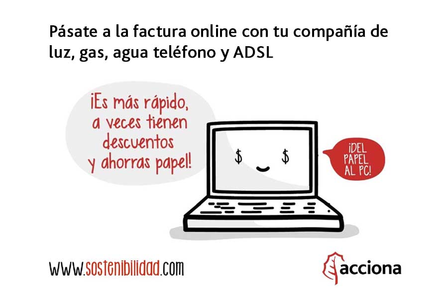 Las compañías proveedoras de servicios: luz, gas, agua, teléfono móvil, fijo, línea de ADSL, proveedores de paquetes de televisión… cuentan en su mayoría ya con la opción de emitir facturas en soporte digital. Si te das alta son todo ventajas: las recibes antes, te avisan al momento, algunas tienen descuento y ayudarás a ahorrar papel.