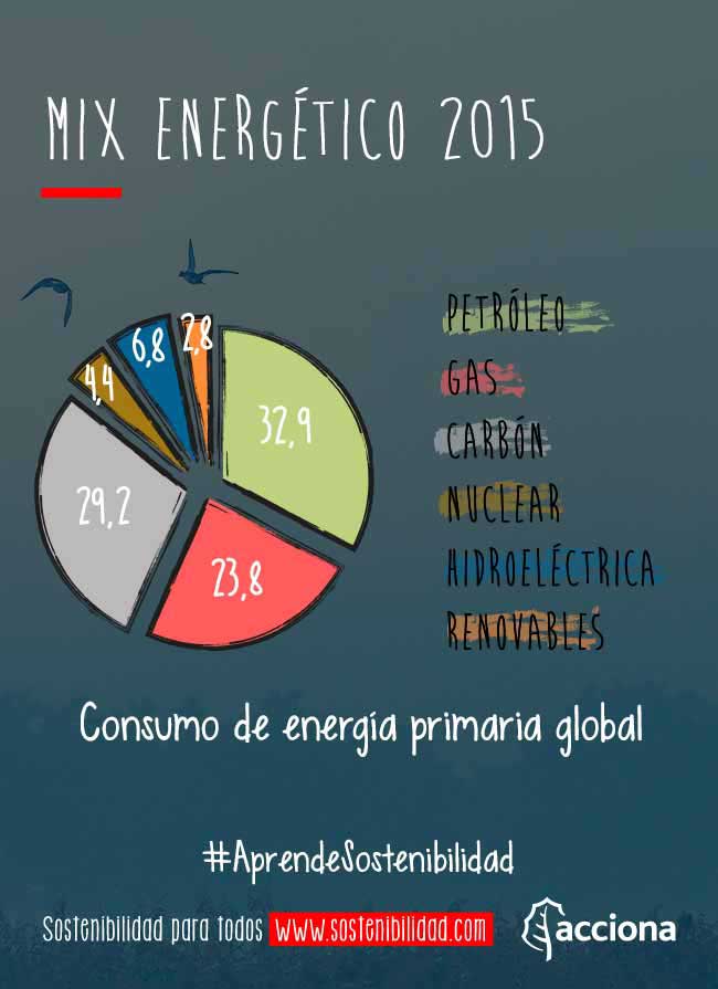 En el año 2015, el petróleo, el gas y el carbón fueron las energías primarias más utilizadas en todo el mundo, si bien las renovables, con la hidroeléctrica a la cabeza, tiene cada vez un mayor grado de implantación.