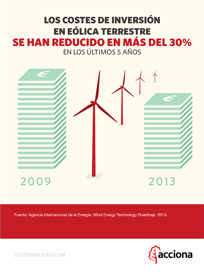 Los costes de inversión en eólica terrestre se han reducido en más del 30% en los últimos 5 años, según el “Wind Energy Technology Roadmap 2013” publicado por la Agencia Internacional de la Energía. #renovables
