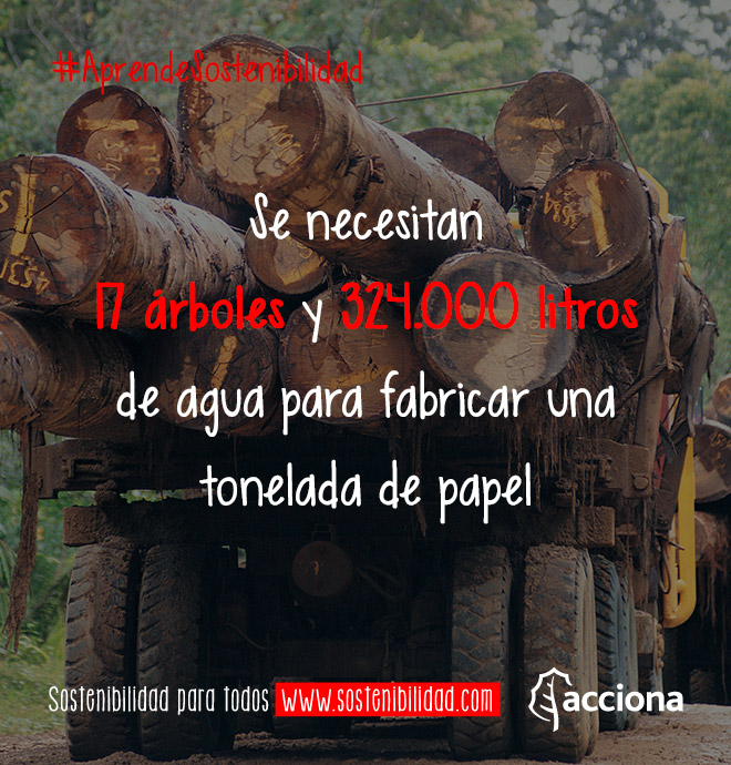 Según la consultora Natura Medio Ambiental, para fabricar una tonelada de papel se necesitan 17 árboles y 324.000 litros de agua. Por cada 54 kilos de papel reciclado se ahorra la tala de un árbol, que puede producir oxígeno para tres personas al día.