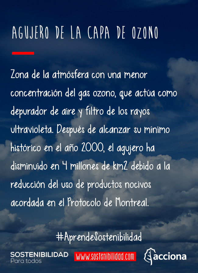 El agujero de la capa de ozono es la zona de la atmósfera con una menor concentración del gas ozono, que actúa como depurador de aire y filtro de los rayos ultravioleta.