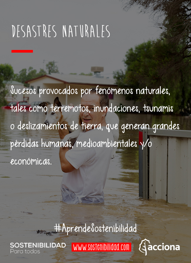 Son desastres naturales los sucesos provocados por fenómenos naturales, tales como terremotos, inundaciones, tsunamis o deslizamientos de tierra, que generan grandes pérdidas humanas, medioambientales y/o económicas.