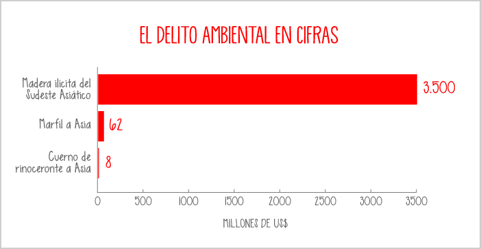 Fuentes: Interpol, El País (Amazonia, finning), Comisión de Supervivencia de Especies IUCN, Convención sobre el comercio internacional de especies amenazadas CITES, Oficina de Naciones Unidas contra el crimen (vida salvaje y bosques) UNODC, The Week (Ghana).
