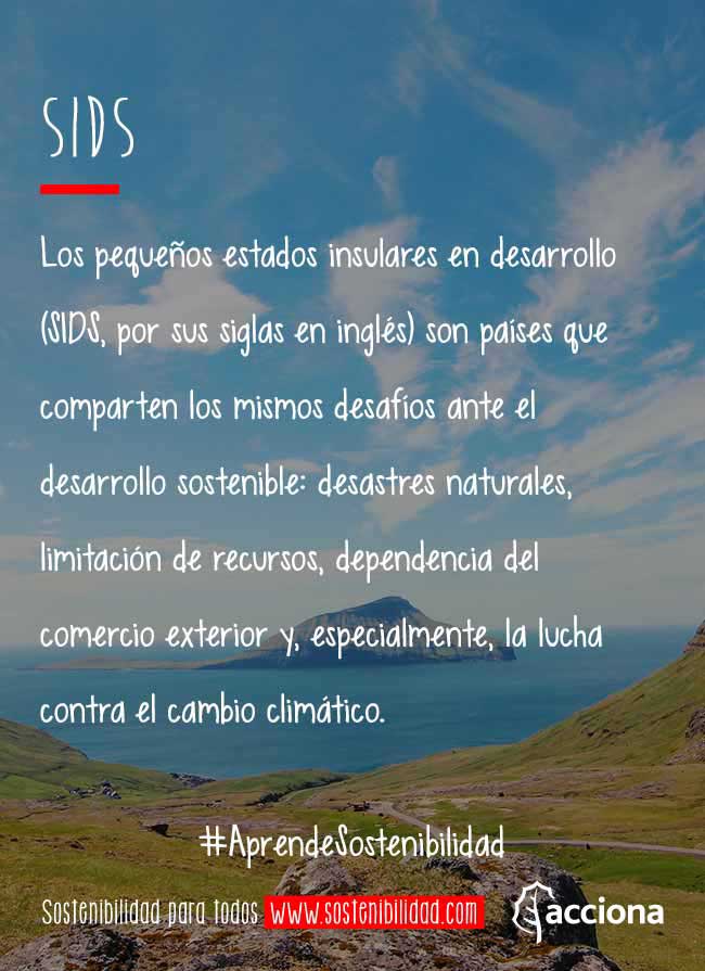 Los Pequeños Estados Insulares en Desarrollo, también denominados SIDS por sus siglas en inglés, son países localizados en pequeñas islas que por sus características económicas y geográficas comparten los mismos desafíos ante el desarrollo sostenible: desastres naturales, limitación de recursos, dependencia del comercio exterior y, especialmente, la lucha contra el cambio climático.