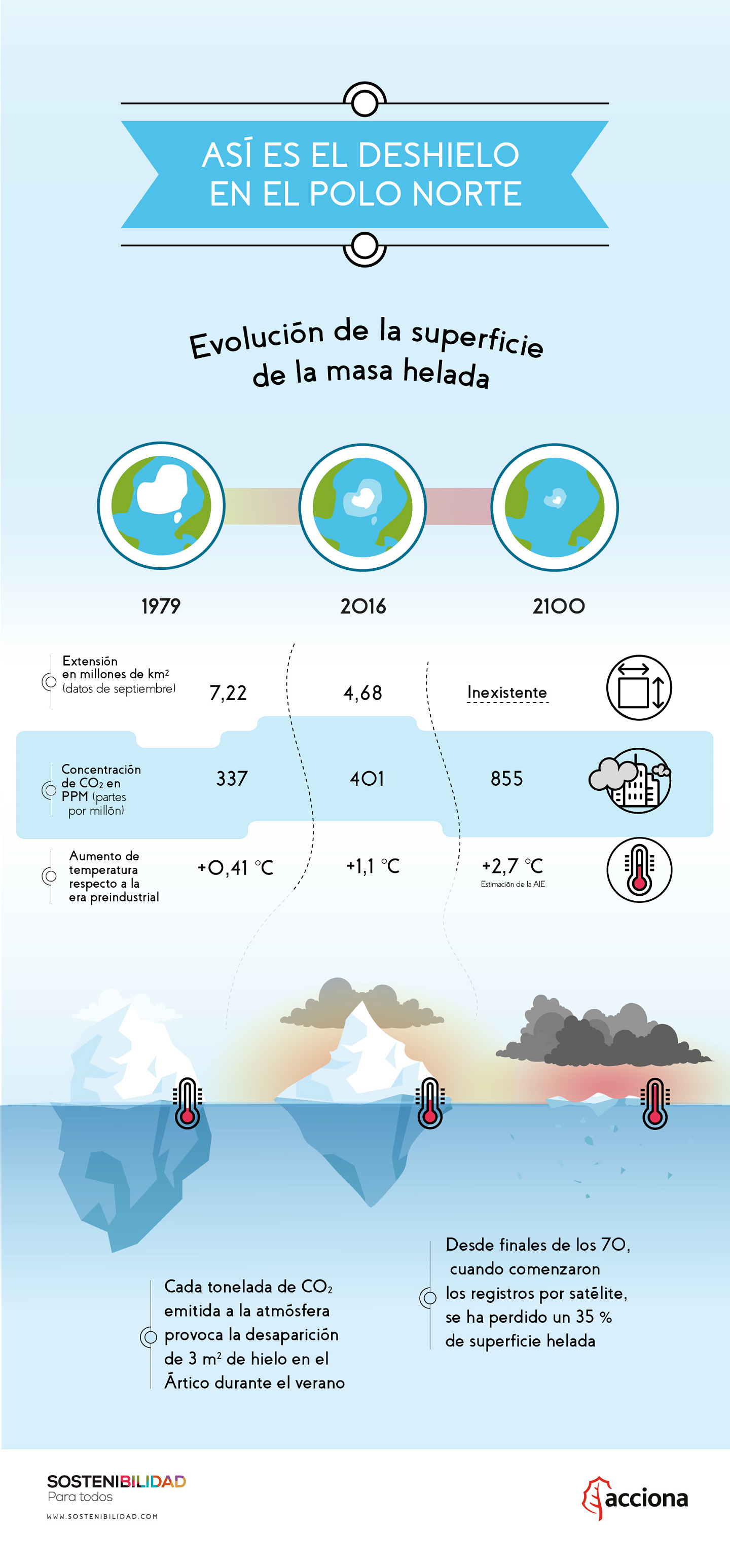 En 1979, con una concentración de 337 PPM y un aumento de la temperatura de 0,41 0C respecto a la era preindustrial, el Polo Norte ocupaba, partiendo de los datos de septiembre, una extensión de 7,22 millones de kilómetros cuadrados. En 2016, la superficie de la masa de hielo ocupaba 4,68 millones de kilómetros cuadrados debido al aumento de la temperatura (+1,1 0C respecto a la era preindustrial) provocado por el aumento de concentración de las partes por millón del CO2 hasta alcanzar las 401 actuales. Esto significa que desde que se empezó a registrar el deshielo con imágenes desde el espacio, el Polo Norte ha perdido el 35 % del hielo.