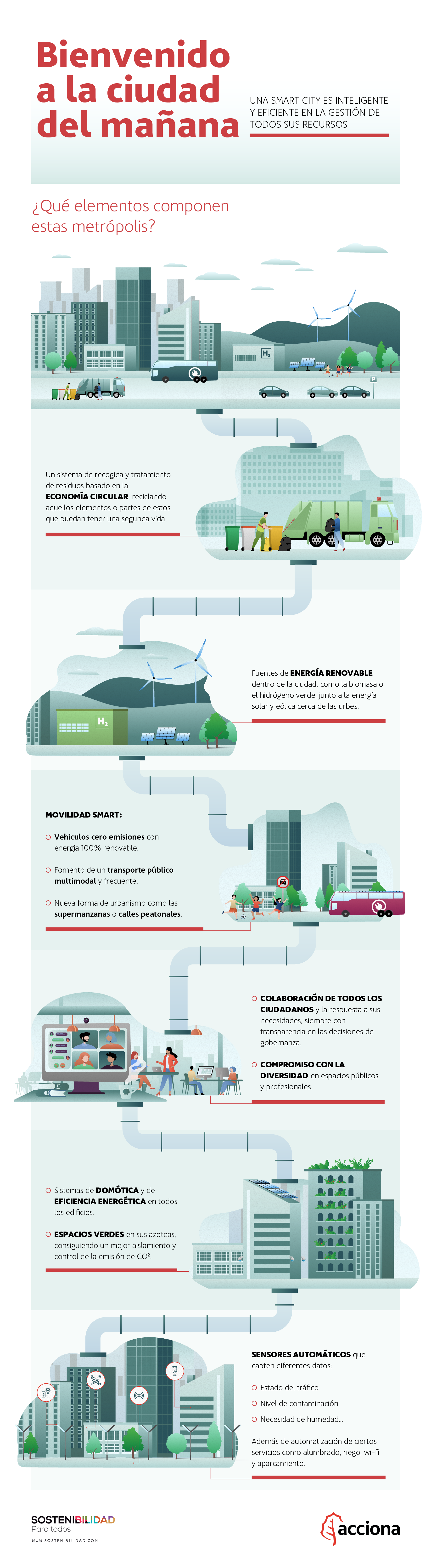 Por tanto, la ciudad del futuro deberá facilitar la vida de las personas que la habitan y promover un cambio en cómo se organizan y gestionan las urbes. A nosotros se nos ocurren varias propuestas que puedes ver en la siguiente infografía: