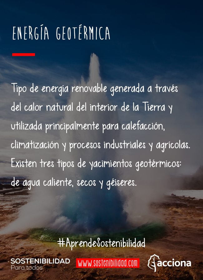 Dentro del abanico de energías renovables, la energía geotérmica es aquella generada a través del calor natural del interior de la Tierra. Existen tres tipos de yacimientos geotérmicos: de agua caliente, secos y géiseres.